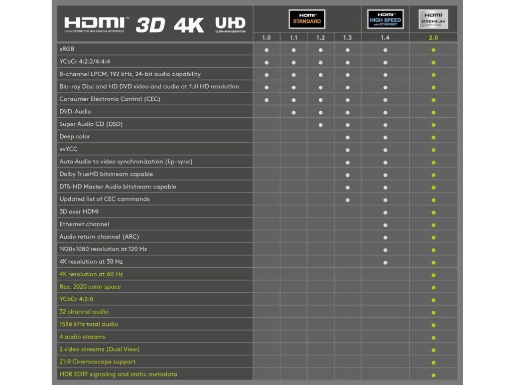 Standard HDMI 2.0 (označovaný také jako High Speed + Ethernet) je klíčový pro každého, kdo vlastní 4K monitor nebo televizi. Oproti starším verzím HDMI umožňuje přenášet dvojnásobné množství snímků za sekundu v 4K rozlišení, což znamená dokonale plynulý pohyb bez trhání – to oceníte zejména u akčních filmů, sportovních přenosů a při hraní videoher.